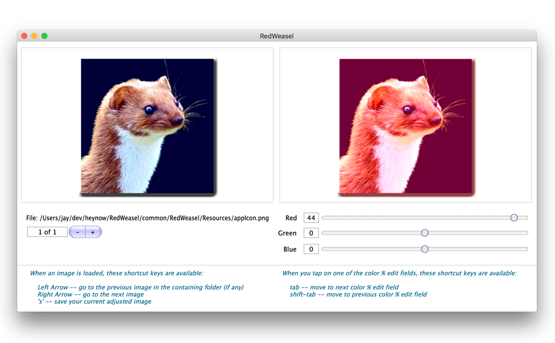RedWeasel, one of our family of weasel apps, lets you easily change the RGB values on a set of images. We created it for a friend who wanted to correct for the red loss in his underwater photos. (Even water at 5ft depth will have a noticeable loss of red.) Our resulting app corrects the red balance, and for good measure green and blue too, making it useful for a wider audience while still keeping the overall simplicity of the weasel apps.