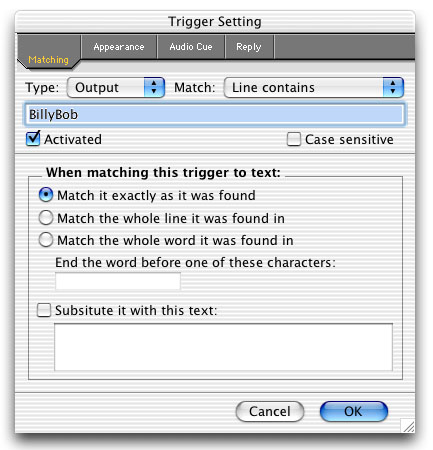 Customizable triggers allow you to match text sent from the world and trigger a custom response from the client (play a sound, alter the text color, send a reply, etc.)