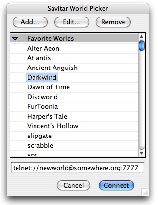 The world settings dialog lets you specify the background color, font color and font face, and determine if Savitar should interpret HTML or ANSI tags.